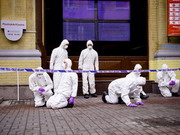 Инсталляция изображает группу людей, одетых в защитные комбинезоны, защитные маски, сапоги и резиновые печати, которые проводят бактериологические измерения.