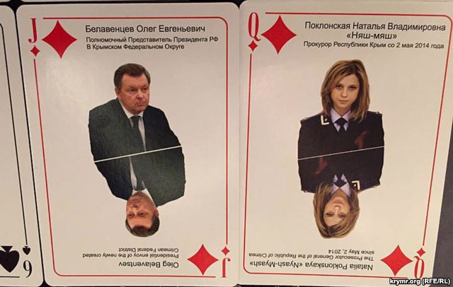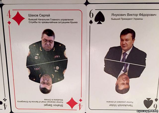 Так, Владимира Путина изобразили в виде пикового туза, а Виктора Януковича – пиковой шестерки. На картах изображено много представителей оккупационной власти и силовиков в Крыму: «председатель Совета министров Крыма» Сергей Аксенов, «спикер Госсовета Крыма Владимир Константинов, представитель президента РФ в Крыму Олег Белавенцев, «председатель Севастопольского горуправления» Алексей Чалый, «прокурор Крыма» Наталья Поклонская, «глава МВД Крыма» Сергей Абисов, крымский Беркут, зеленые человечки и другие.