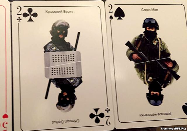В США можно купить колоду из 52-х игральных карт, на которых изображены крымские и российские политики, а на обороте — матрешки в виде «зеленых человечков» с автоматами.