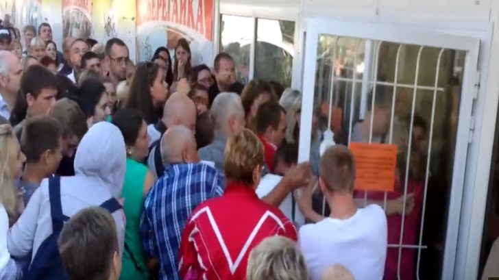 Россияне создали давку у дверей магазина и чуть ли не дерутся за право стать счастливым покупателем еды.