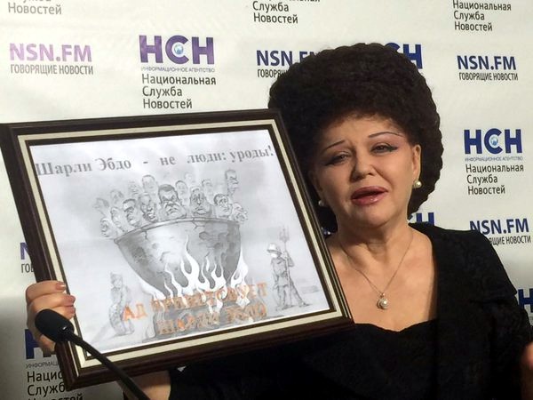 На карикатуре, которую представила сентатор Петренко, изображены люди, кипящие в котле и написано «Шарли Эбдо — не люди: уроды!» и «Ад приветствует Шарли Эбдо».
