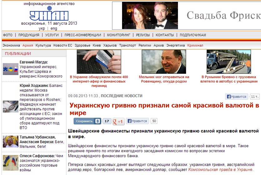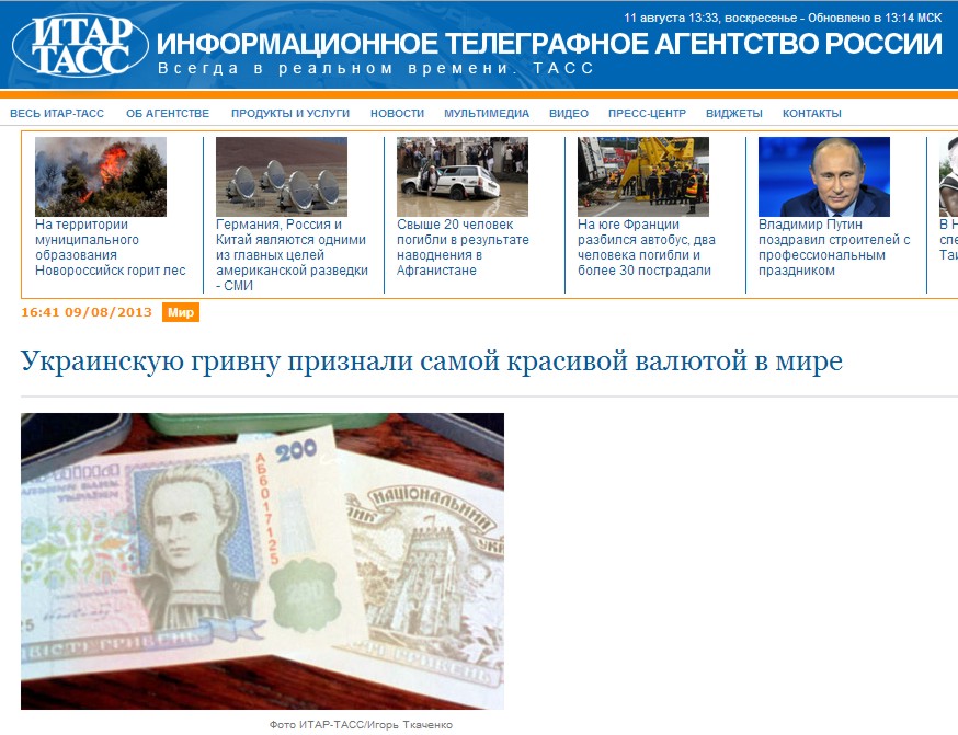 Со ссылкой на УНИАН «новость» о самой красивой валюте мира перепечатывают Газета.RU (16:54) израильский 9-й канал (18:38). Новостной фейк выходит на международный уровень. Болгарское новостное агентство Novinite распространяет его со ссылкой на ИТАР-ТАСС.