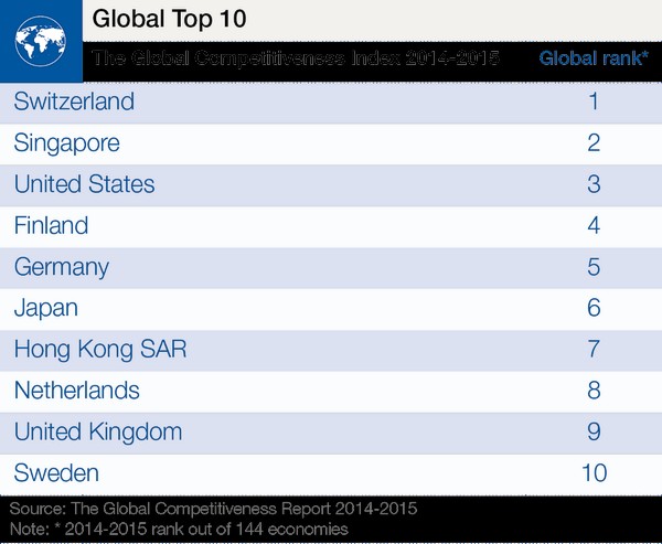Об этом свидетельствует доклад Глобальная конкурентоспособность 2014-2015, подготовленный экспертами Всемирного экономического форума (ВЭФ) и опубликованный 3 сентября на сайте Всемирного экономического форума — организатора рейтинга.