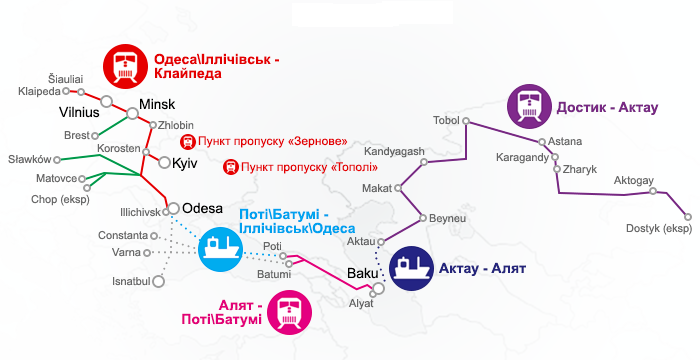 Контейнерный поезд, которым будут осуществляться поставки товаров и- Украины в страны Азии, проследует маршрутом Украина-Грузия-Азербайджан-Казахстан-Китай. Сначала грузы на пароме будут доставлены морем в Грузию, далее – по железной дороге в Азербайджан, потом снова морем в Казахстан, а уже оттуда – поездами в Китай.