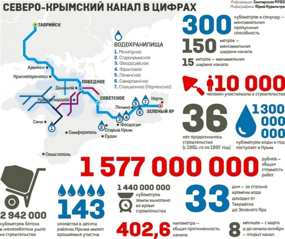 Украина обеспечивает до 85% потребностей Крыма в пресной воде через Северо-Крымский канал, соединяющий главное русло Днепра с полуостровом.