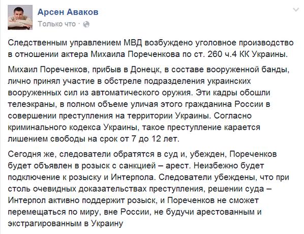 Ранее глава МВД Украины Арсен Аваков сообщил, что следственным управлением МВД Украины возбуждено уголовное производство в отношении гражданина РФ актера Михаила Пореченкова по ч. 4 ст. 260 («участие в непредусмотренных законом военизированных или вооруженных формированиях») УК Украины. Санкции этой статьи предусматривают лишение свободы от 7 до 12 лет.
