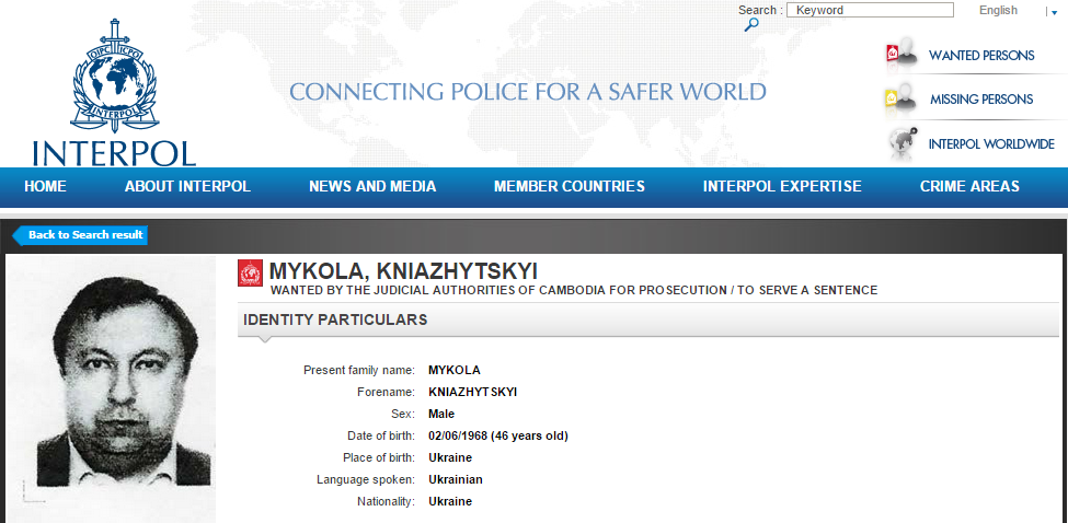 На сайте международной криминальной полиции «Интерпол» в разделе «Разыскиваемые персоны» появилась страница с информацией о розыске Николая Княжицкого.