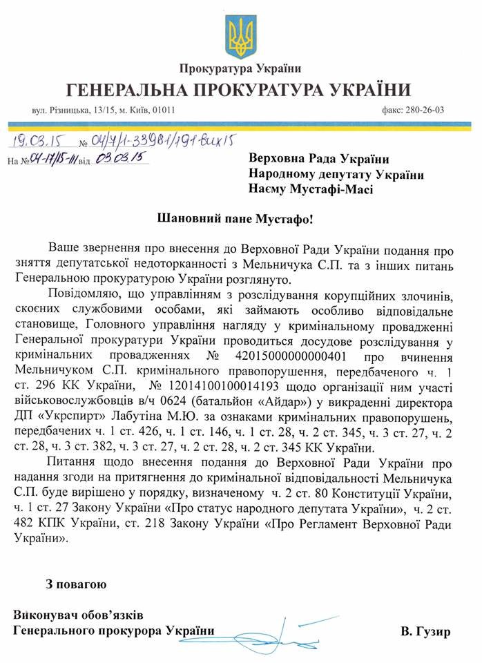 По его словам, сегодня он получил официальный ответ из ГПУ на депутатский запрос. «Бывший комбат "Айдара" Сергей Мельничук подозревается в привлечении бойцов батальона к похищению экс-главы ГП "Укрспирт" Михаила Лабутина»,— сообщил Найем, добавив, что сейчас решается вопрос о привлечении нардепа к уголовной ответственности и снятии депутатской неприкосновенности.