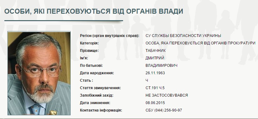Согласно официальной информации, Табачник исчез из поля зрения правоохранителей 6 июня 2015 года. Бывшему министру инкриминируется ч. 5 ст. 191 УК Украины — «присвоение, растрата чужого имущества или завладение им путем злоупотребления служебным положением» и наказывается штрафом до 50-ти необлагаемых минимумов доходов или исправительными работами на срок до 2-х лет, или лишением свободы на срок до 4-х лет с лишением права занимать определенные должности или заниматься определенной деятельностью на срок до 3-х лет или без такового.
