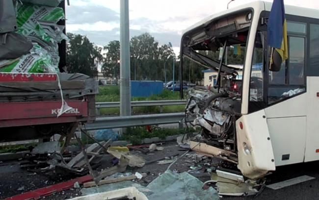 После столкновения автобус въехал в полуприцеп грузовика Renault, который двигался в попутном направлении, добавили в милиции.