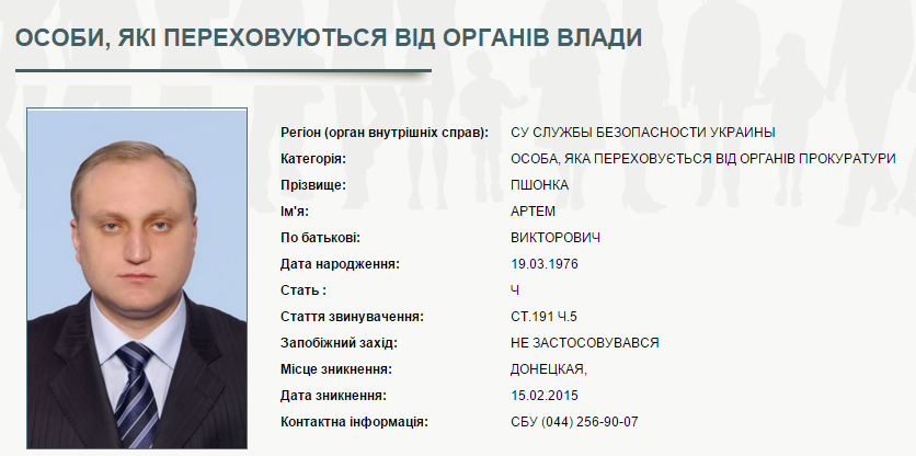 Служба безопасности Украины (СБУ) объявила в розыск сына бывшего генпрокурора Виктора Пшонки, экс-депутата Верховной Рады от Партии регионов Артема Пшонку.