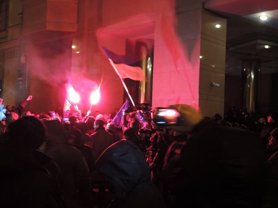 Участники акции протеста выкрикивали «Ахметов, вон из Украины!», а также бросали в сторону правоохранителей дымовые шашки и файеры.