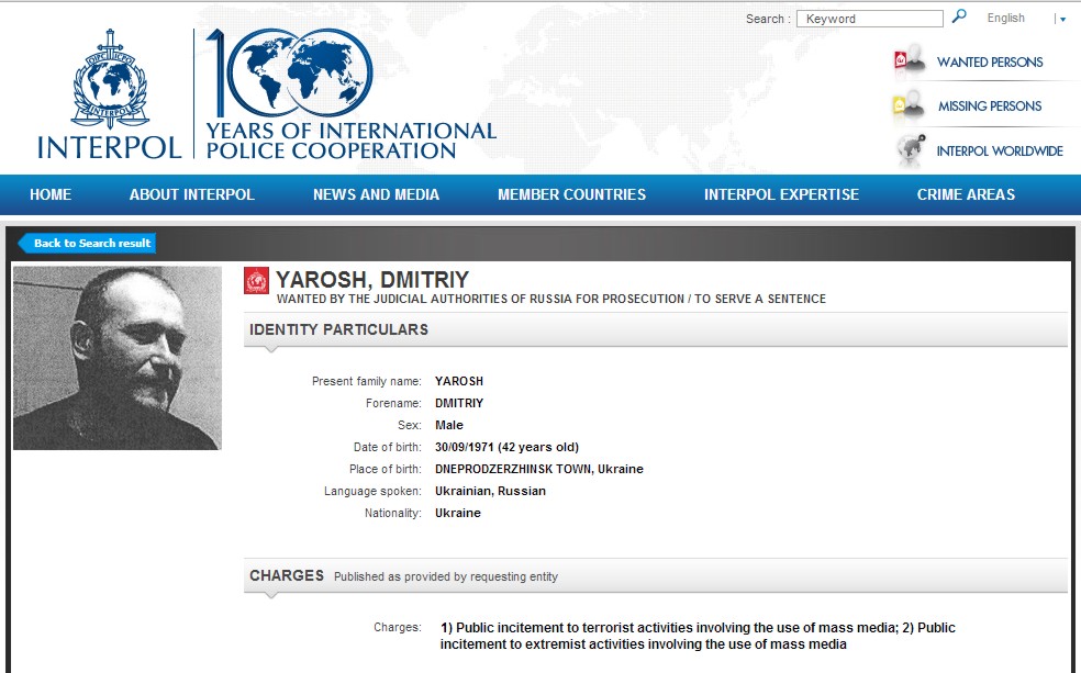 В настоящее время розыскная информация о Яроше отсутствуют в базе данных на сайте Интерпола. Представители Интерпола не комментируют данный факт.