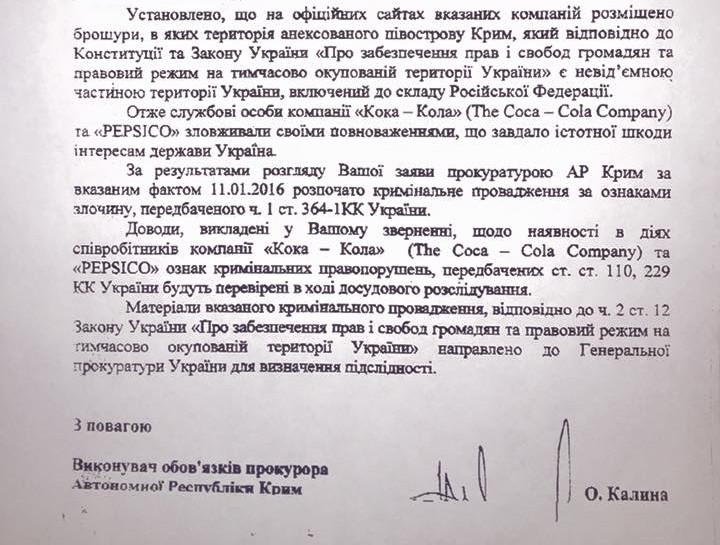 «Должностные лица "Кока-Кола" и "Пепси" таки могут сесть в тюрьму. Сегодня получил официальный ответ прокуратуры АР Крым о том, что 11.01.2016 года начато уголовное производство по ч.1 ст.364-1 («злоупотребление полномочиями должностным лицом» — ред.) УК Украины. В отношении преступлений, предусмотренных ст. 110 («посягательство на территориальную целостность» — ред.) и ст. 229 («незаконное использование знака для товаров и услуг, фирменного названия, квалифицированного указания происхождения товара» — ред.) УК Украины — продолжается проверка», — написал нардеп.
