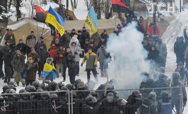 В какой-то момент неизвестный из одной из групп протестующих бросил в сторону Верховной Рады несколько «коктейлей Молотова», которые разбились рядом с разложенными шинами, после чего возникли столкновения полиции с митингующими.