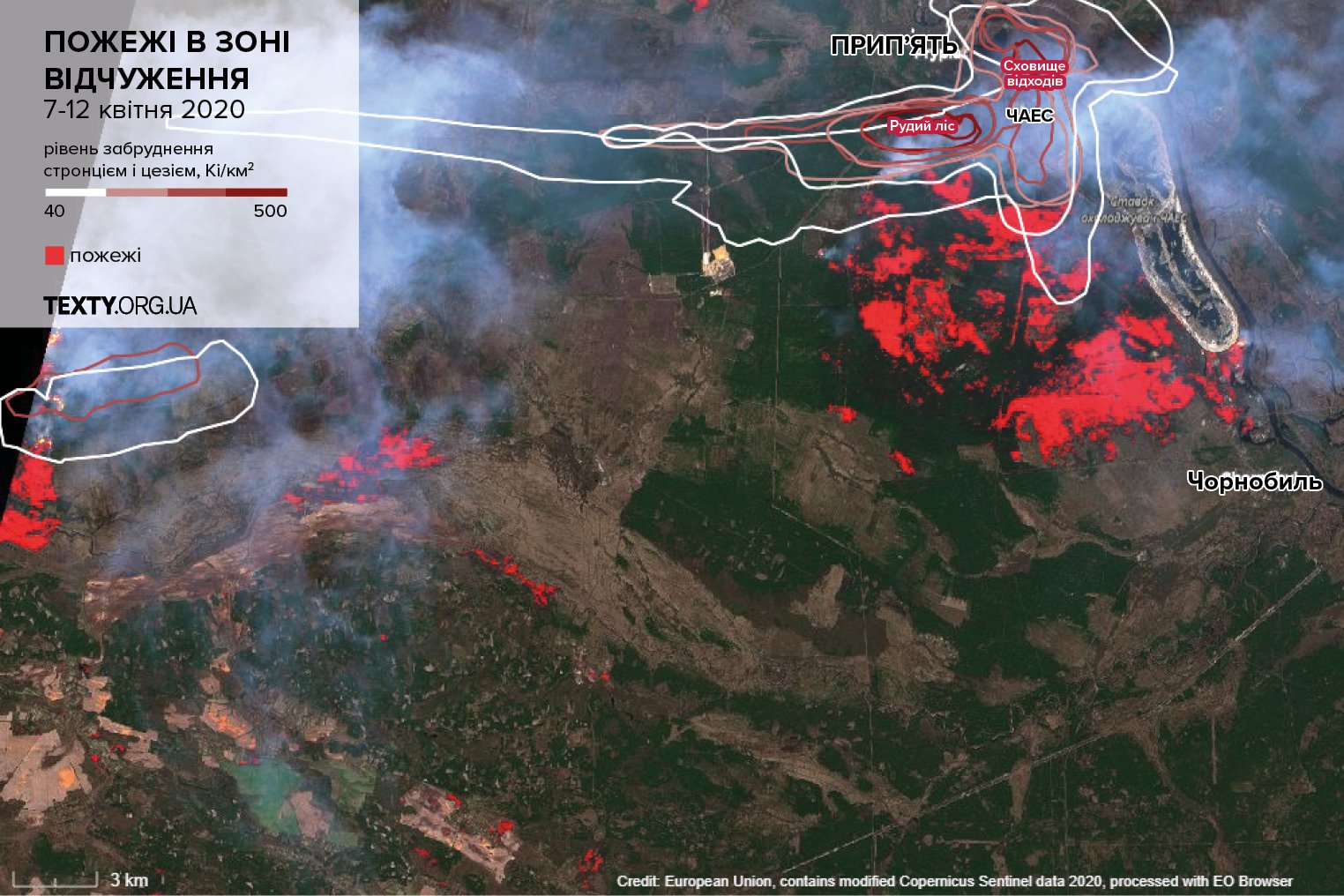 Пожары в Чернобыльской зоне продолжаются с 4 апреля и уничтожили тысячи гектаров леса. В воскресенье, 12 апреля, пожар наблюдали на территории закрытой Чернобыльской АЭС.