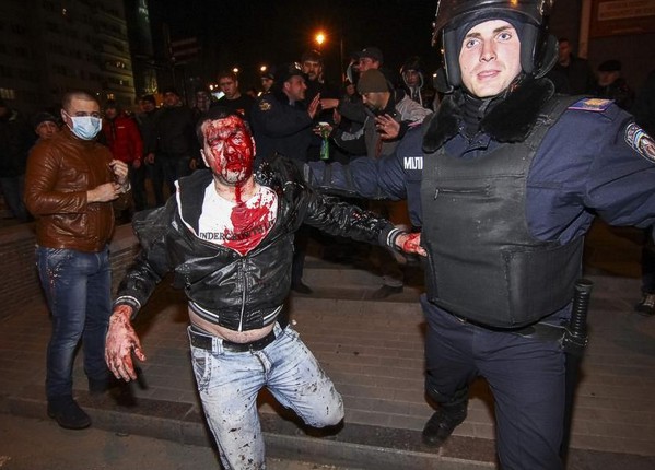 А после того как митинг за единство Украины был завершен, агрессивно настроенные пророссийские активисты бросились вслед за уходящими митингующими и начали их избивать.