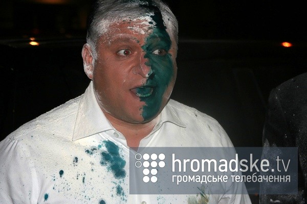 Кандидата в президенты Украины от Партии регионов Михаила Добкина в Киеве облили зеленкой и посыпали мукой.