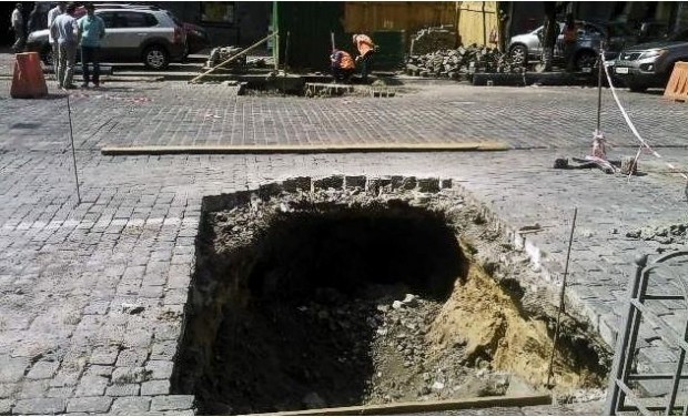 Сегодня, 26 мая, утром в центре Киева на улице Богдана Хмельницкого, напротив здания Министерства энергетики и угольной промышленности провалился участок дороги.