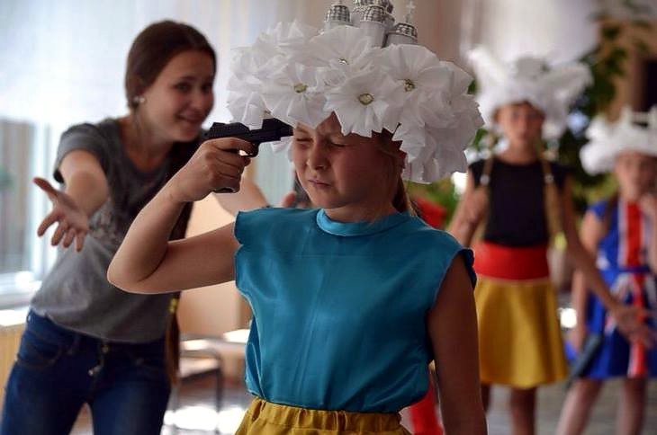 Девчушки в костюмах-флагах разных стран выходили под музыку на подиум, с пистолетами и автоматами в руках, целились в зрительный зал, а в финале девочка — Украина пыталась застрелиться...