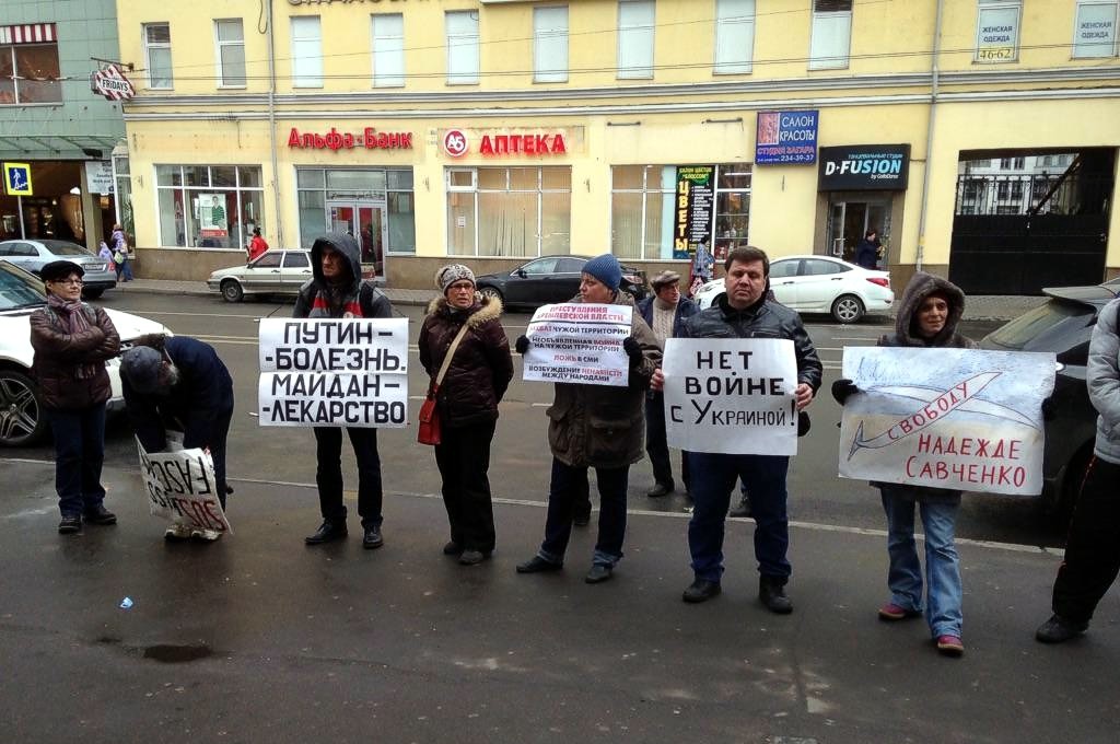 В руках они держали плакаты с надписями: «Путин — болезнь, Майдан — лекарство», «SOS, русский фашизм», «Путин — наш геморрой», «Нет войне с Украиной», «Свободу Надежды Савченко».