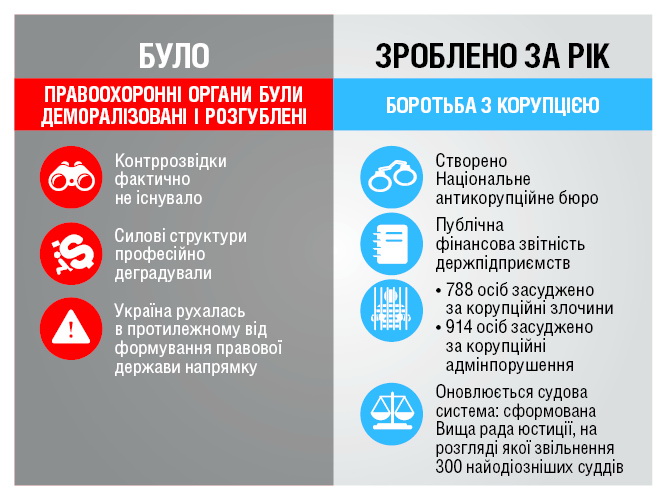 Що ж у нас в активі, крім твердої політичної волі? Активно створюємо законодавчу базу і будуємо інфраструктуру боротьби з корупцією. Ключове — безпрецедентно відкриті підбір та призначення Директора Національного антикорупційного бюро. Незалежна комісія з громадських авторитетів обирала серед приблизно 170 кандидатур. Тепер до бюро так само на конкурсній основі прозоро шукають детективів, і така прискіплива селекція потребує деякого часу. Тим не менше, перші детективи з’являться вже в червні, а в жовтні бюро має почати повноцінні розслідування.