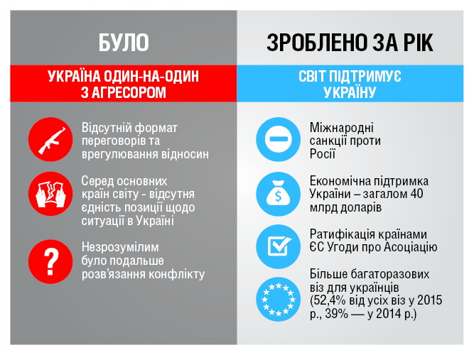 Масштабна макрофінансова допомога з боку МВФ та інших міжнародних організацій, держав Євросоюзу, США, інших країн (як найсвіжіший приклад — рішення країн Великої сімки підтримати Україну в питанні реструктуризації наших зовнішніх боргів) — все це разом з непростими і дуже не популярними рішеннями та ефективними діями всіх гілок влади дозволило уникнути дефолту, вдалося стабілізувати макроекономічну ситуацію, вдалося, що майже неможливо в умовах воюючої країни, без затримок виплачувати зарплати й пенсії, уповільнити падіння економіки, подолати паніку на валютному ринку. На жаль, в світовій історії нема прикладів, коли б країна, проти якої здійснюється агресія, демонструвала б економічний бум і зростання соціальних стандартів.