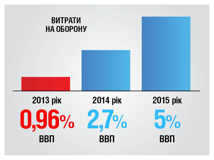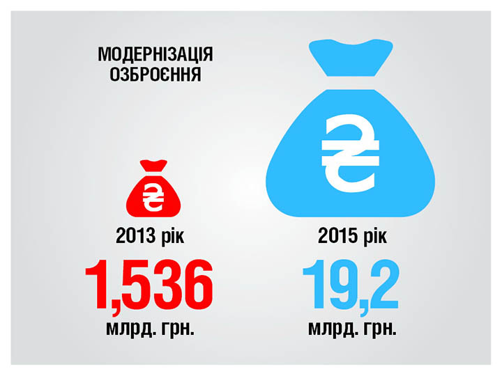 У зв'язку із перманентною загрозою розгортання Росією повномасштабної війни проти України, забезпечення обороноздатності держави надовго залишиться нашим ключовим пріоритетом. Як би не було важко, в бюджеті на 2016 рік ми знову підемо на збільшення видатків на оборону. Бо по-іншому ми країну не захистимо. Чому ми вимушені це робити? Бо сьогодні Україна воює, як би там не було часто-густо, зі зброєю ХХ століття проти росіян, які озброєні зброєю ХХІ століття. І наше надзавдання — переозброїти нашу армію, бо бойовий дух і досвід найкращі українські Збройні Сили вже мають.