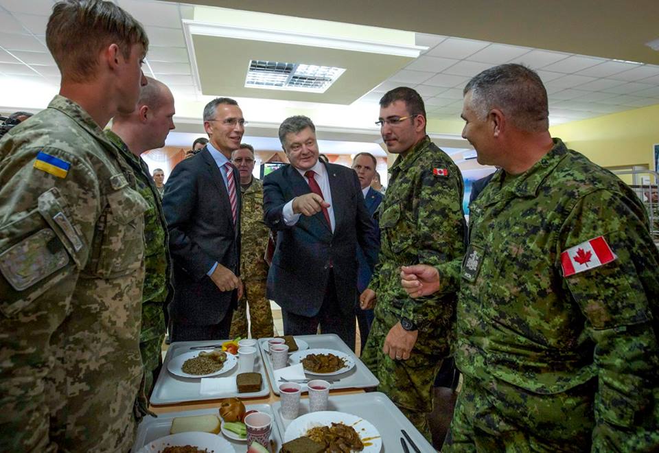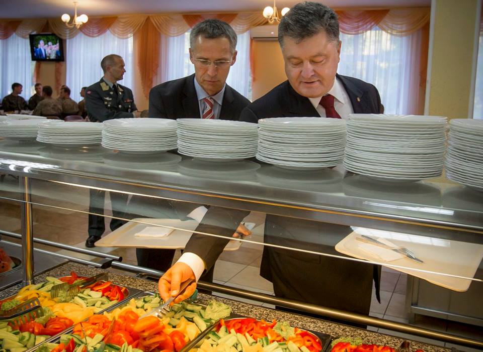 Президент Украины Петр Порошенко вместе с прибывшим в Украину генеральным секретарем НАТО Йенсом Столтенбергом (Jens Stoltenberg) пообедали в солдатской столовой.