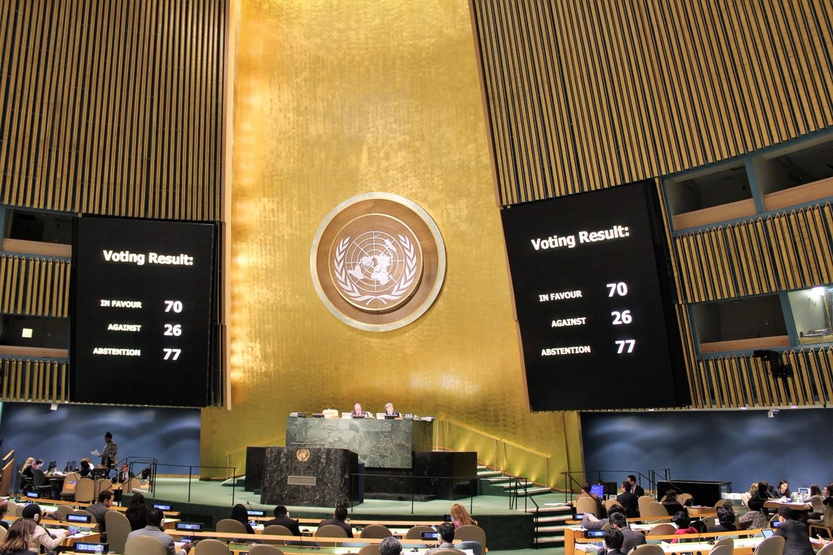 Согласно сообщению, «за» резолюцию проголосовали 70 стран, против — 26, воздержались — 77.