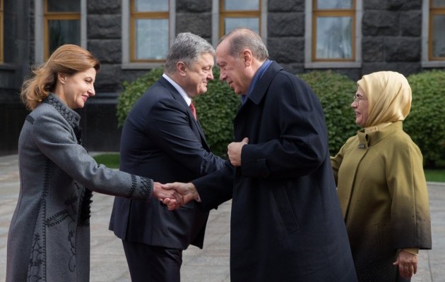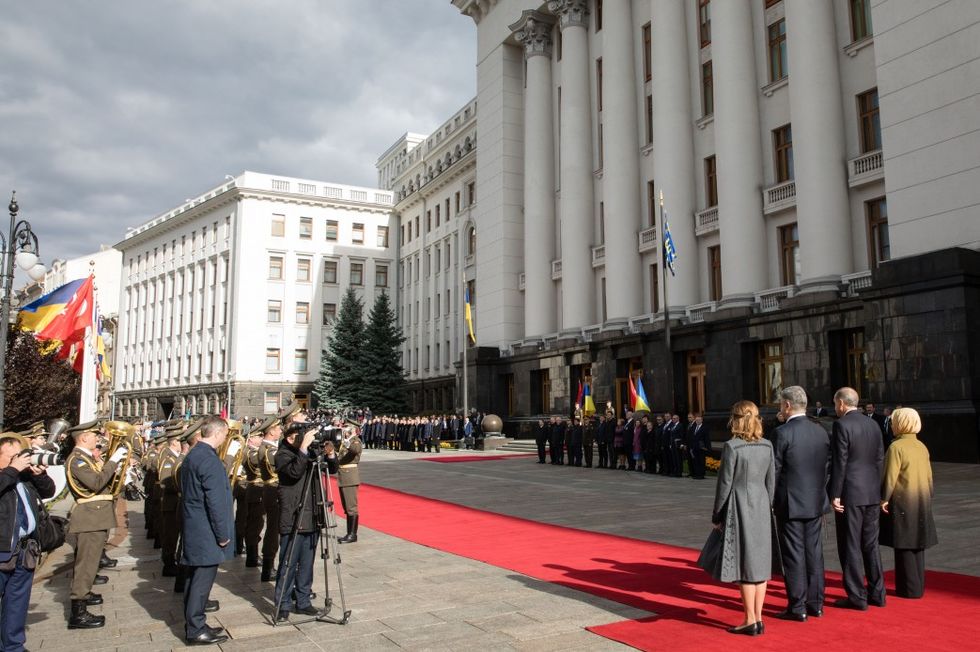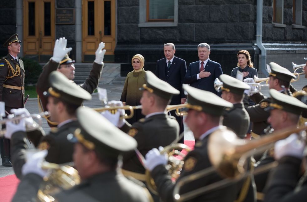 После этого чета Эрдоганов отправилась в Администрацию президента Украины, где состоялась церемония встречи с президентом Петром Порошенко и его женой.