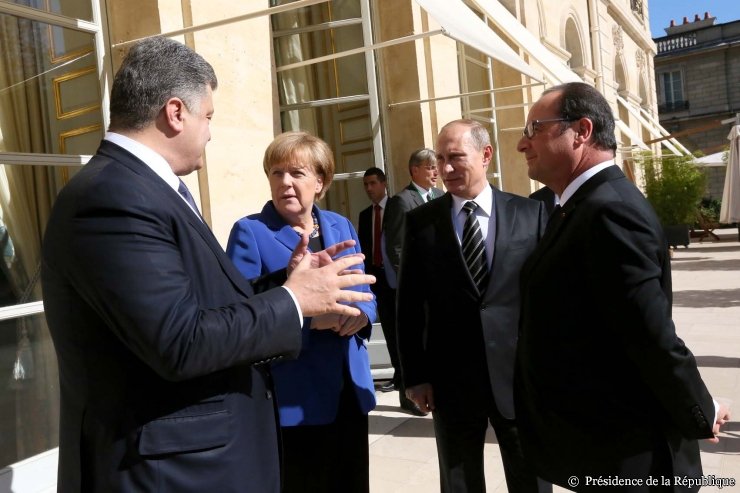 «После провала режима прекращения огня, бои между украинскими войсками и парамилитарными сепаратистскими отрядами возобновились с новой силой. Мы надеялись прекратить стрельбу, найдя компромисс, который сохранил бы территориальную целостность Украины, но конференция на первом этаже длилась бесконечно и была безрезультатной: это соответствовало целям российской стороны», — рассказывает Олланд.