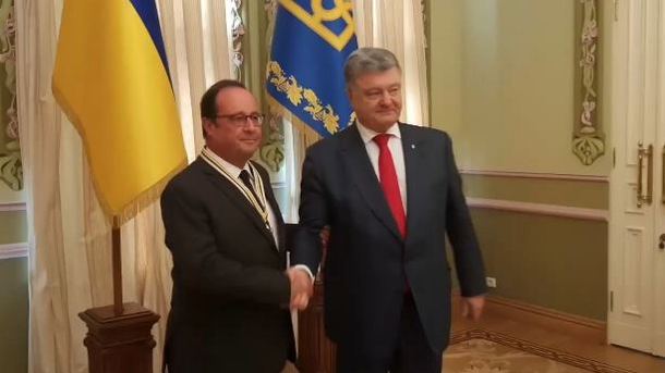 «Имею честь вручить Франсуа Олланду высокую государственную награду Украины — Орден Свободы. Эта наивысшая государственная награда символизирует нашу безграничную благодарность за ту принципиальную позицию, которую Франсуа Олланд проявил, поддерживая наш суверенитет, территориальную целостность и независимость», — сказал Порошенко.