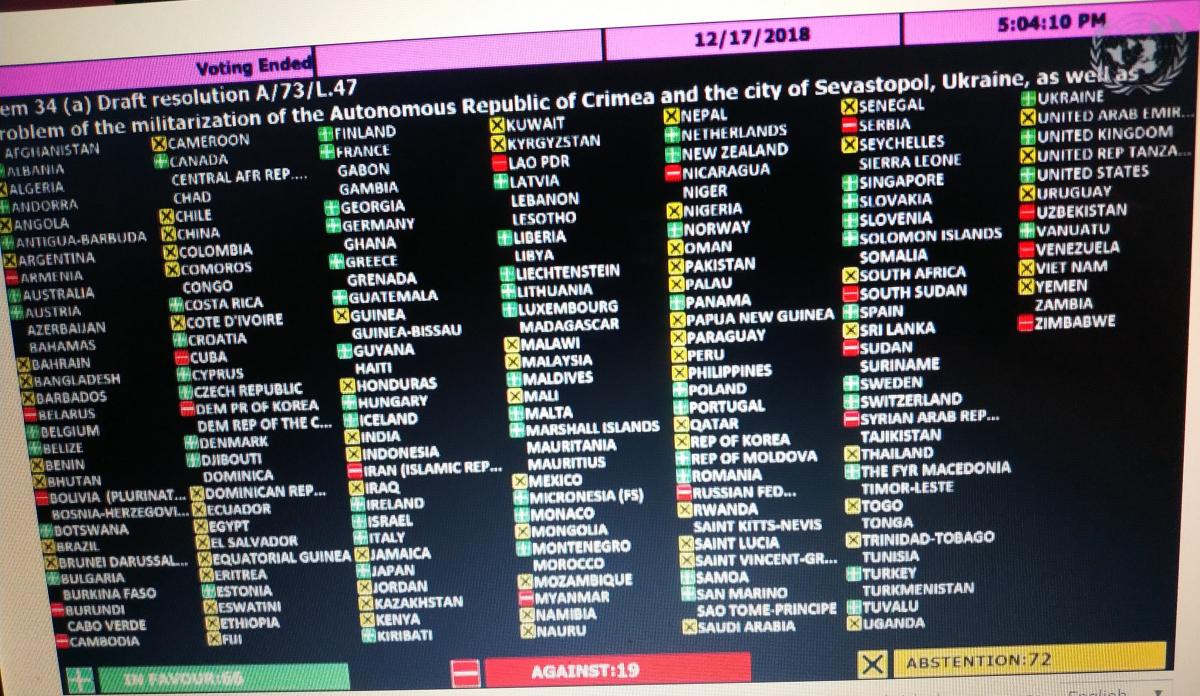 В частности, «против» проголосовали Армения, Беларусь, Боливия, Бурунди, Камбоджа, Куба, КНДР, Иран, Лаос, Мьянма, Никарагуа, Россия, Сербия, Южный Судан, Судан, Сирия, Узбекистан, Венесуэла, Зимбабве.