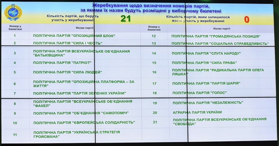 Центральная избирательная комиссия (ЦИК) Украины провела в среду, 26 июня, жеребьевку по определению номеров политических партий для размещения их названий в избирательном бюллетене для голосования на внеочередных выборах народных депутатов Украины 21 июля 2019 года в общегосударственном многомандатном избирательном округе.