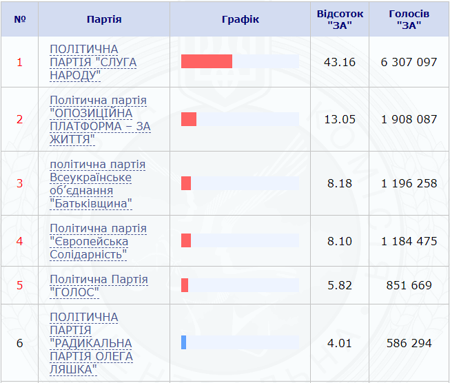 По результатам подсчета голосов, «Слуга народа» набрала 43,16% голосов избирателей (6 млн 307 тыс. 097 человек), партию «Оппозиционная платформа — За жизнь» поддержали 13,05% избирателей (1 млн 908 тыс. 087 голосов), ВО «Батькивщина» — 8,18% (1 млн 196 тыс. 258 голосов), «Европейскую солидарность» — 8,10% (1 млн 184 тыс. 475 голосов) и партию «Голос» — 5,82% (851 тыс. 669 голосов).