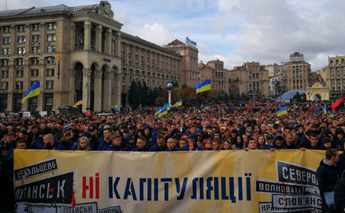 6 октября на Майдане Независимости в Киеве прошло вече под лозунгом «Остановим капитуляцию». На акцию протеста по разным оценкам пришло от 10 до 20 тысяч человек.