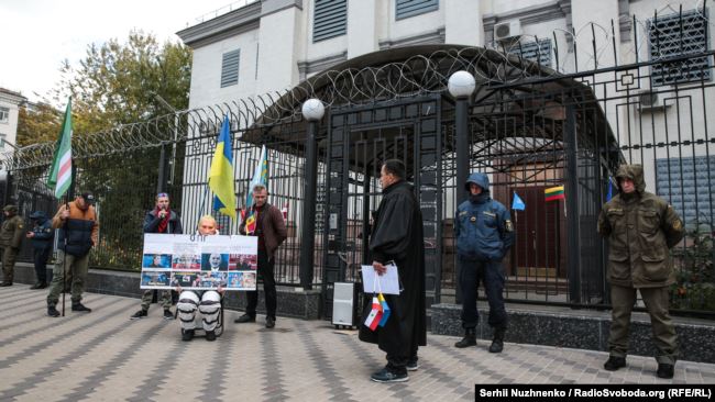 Как сообщало «Радио Свобода», 7 октября, в день рождения российского президента, в Киеве под зданием посольства РФ активисты устроили акцию-перформанс «Суд над Путиным».