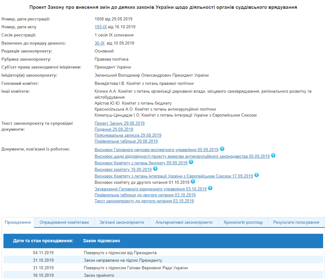 Стоит отметить, что в Раду были внесены проекты постановлений, которыми предлагалось отменить принятие судебной реформы главы государства, однако 31 октября Верховная Рада разблокировала подписание законопроекта №1008 для спикера парламента и президента.