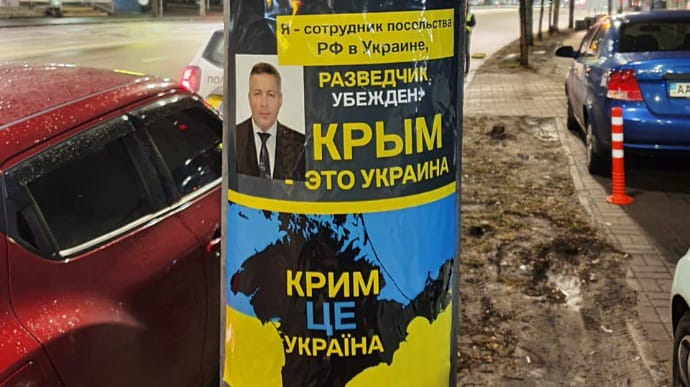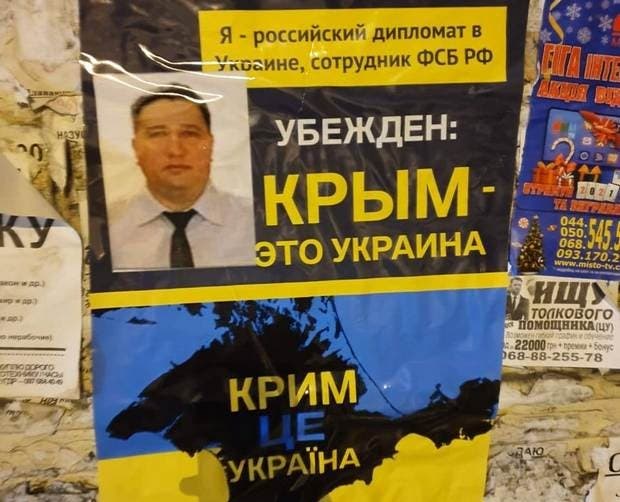 Ранее сообщалось, что в ночь на 16 марта, к годовщине незаконно проведенного РФ «референдума» в Крыму, в Киеве возле мест проживания и работы российских дипломатов появились плакаты, на которых россияне «признаются», что работают на спецслужбы и признают Крым украинским.