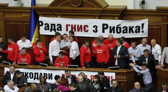 Президиум парламента заняли народные депутаты от фракции партии “УДАР”. Дверь, через которую входят в президиум ВР, заблокировали народные депутаты из фракции ВО «Свобода», а трибуну парламента — депутаты из фракции «Батькивщина».