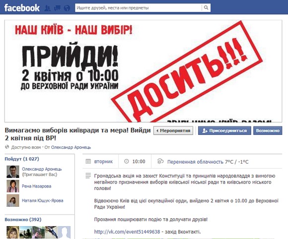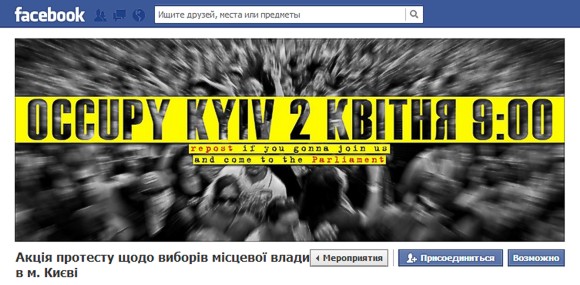 «Occupy Kyiv 2 апреля» приглашает: «Если ты киевлянин, — приходи 2 апреля в 9:00 под Верховную Раду Украины, чтобы отстоять свое право на выборы местной власти».