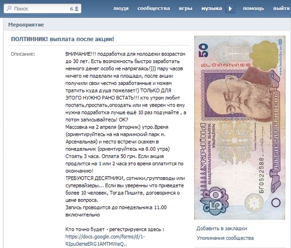 В то же время в соцсетях приглашают принять участие в некотором митинге в Киеве 2 апреля, за участие в котром предлагается 50 гривен.
