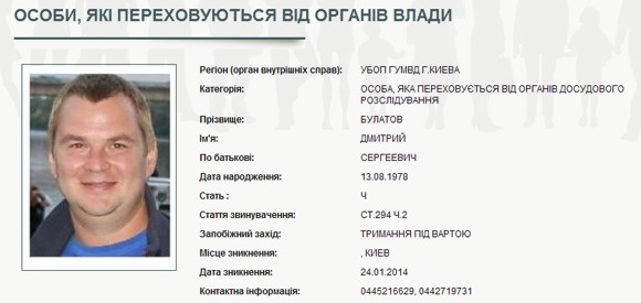 В частности, Дмитрий Булатов значится как лицо, скрывающееся от органов досудебного следствия. Обвиняется по статье 294 части 2 УК Украины («массовые беспорядки, приведшие к гибели людей либо иным тяжким последствиям»), санкциями этой статьи предусматрено лишение свободы на срок от восьми до 15 лет.