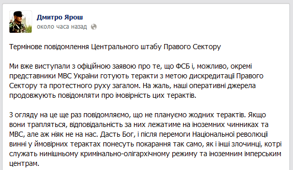 «Мы уже выступали с официальным заявлением о том, что ФСБ и, возможно, отдельные представители МВД Украины готовят теракты с целью дискредитации Правого сектора и протестного движения в целом . К сожалению, наши оперативные источники продолжают сообщать о вероятности этих терактов».