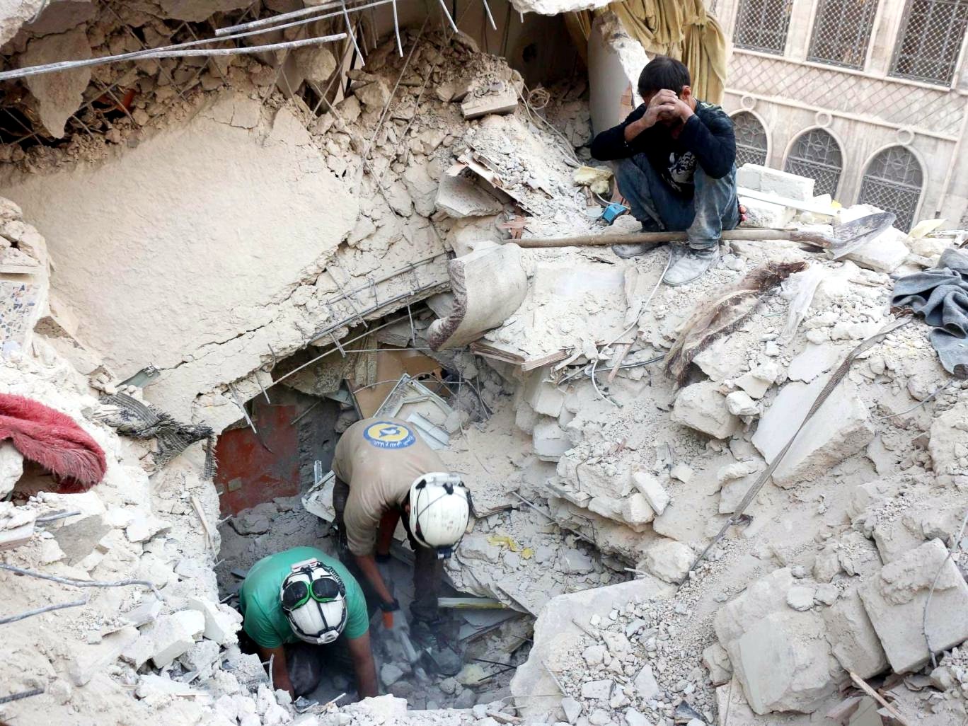 Сирийские добровольцы гражданской обороны, известной как «белые каски», ищут жертв среди обломков разрушенных зданий после авиаудара в удерживаемом повстанцами районе Бустан Аль-Баша в северной части Алеппо.