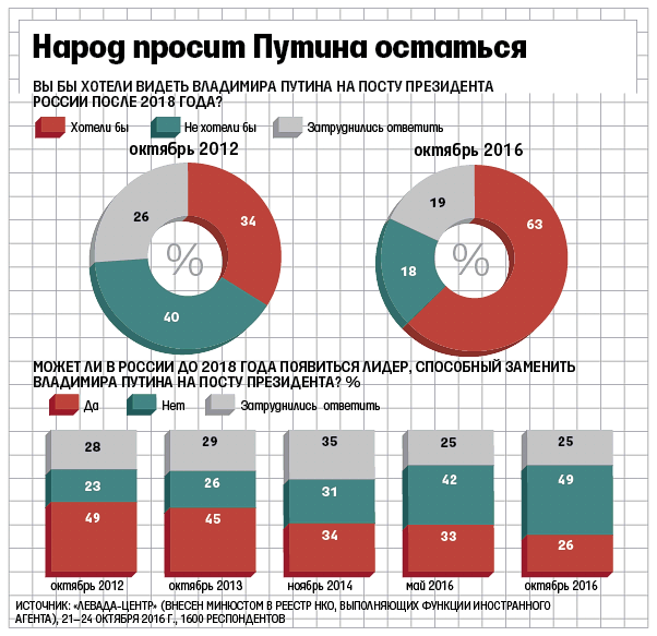 В то же время, 49% россиян сомневаются, что до 2018 года в России может появиться лидер, способный заменить Путина, и лишь 26% (против 49% в 2012 году) допускают такой вариант.