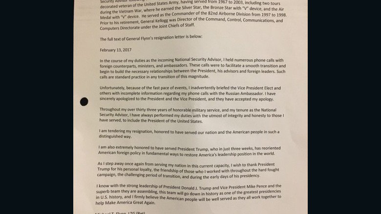 В своем заявлении об отставке Флинн признал, что он не намеренно не проинформировал администрацию о своих контактах с Россией и уже извинился перед президентом.