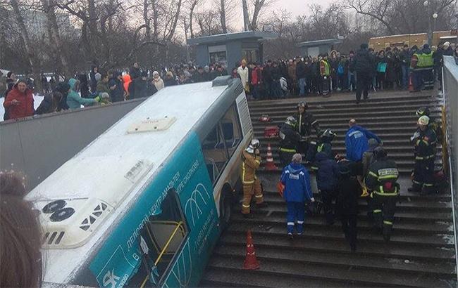 На видео происшедшего, опубликованном РЕН ТВ в Twitter, видно, как автобус на большой скорости съехал в подземный переход по лестнице, по которой в тот момент шли люди.