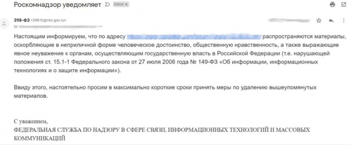 Согласно указанному закону, генпрокуратура должна обратиться в Роскомнадзор «с требованием ограничить доступ к информационным ресурсам, распространяющим такую информацию, в случае её неудаления».